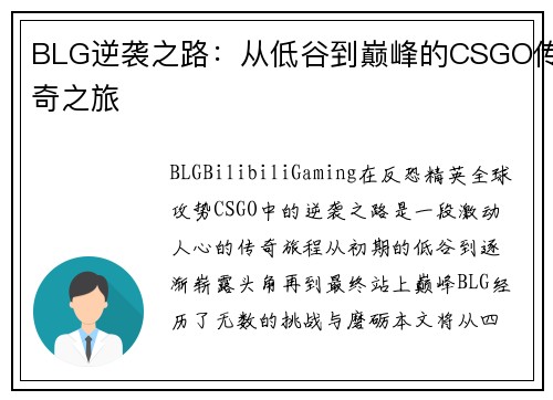 BLG(Bilibili Gaming)在《反恐精英:全球攻势》(CSGO)中的逆袭之路,是一段激动人心的传奇旅程。从初期的低谷到逐渐崭露头角,再到最终站上巅峰,BLG经历了无数的挑战与磨砺。本文将从四个方面详细探讨BLG的成长历程,包括团队初创背景、阵容变更与战术调整、赛事表现及突破,以及未来发展方向。这些因素共同构成了BLG令人振奋的逆袭故事,展示了电竞圈竞争的残酷与美好,也为其他战队提供了宝贵的经验与启示。