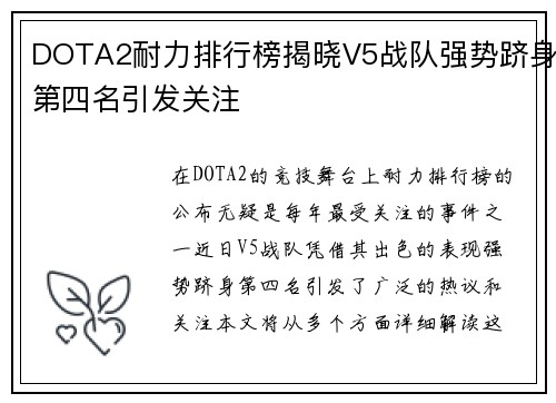 在DOTA2的竞技舞台上,耐力排行榜的公布无疑是每年最受关注的事件之一。近日,V5战队凭借其出色的表现强势跻身第四名,引发了广泛的热议和关注。本文将从多个方面详细解读这一事件,包括V5战队的表现分析、其他战队动态、耐力排行榜的重要性以及未来展望。通过这些分析,我们可以更全面地理解V5战队在DOTA2赛事中的地位变化,以及这一排名背后所反映出的行业趋势。